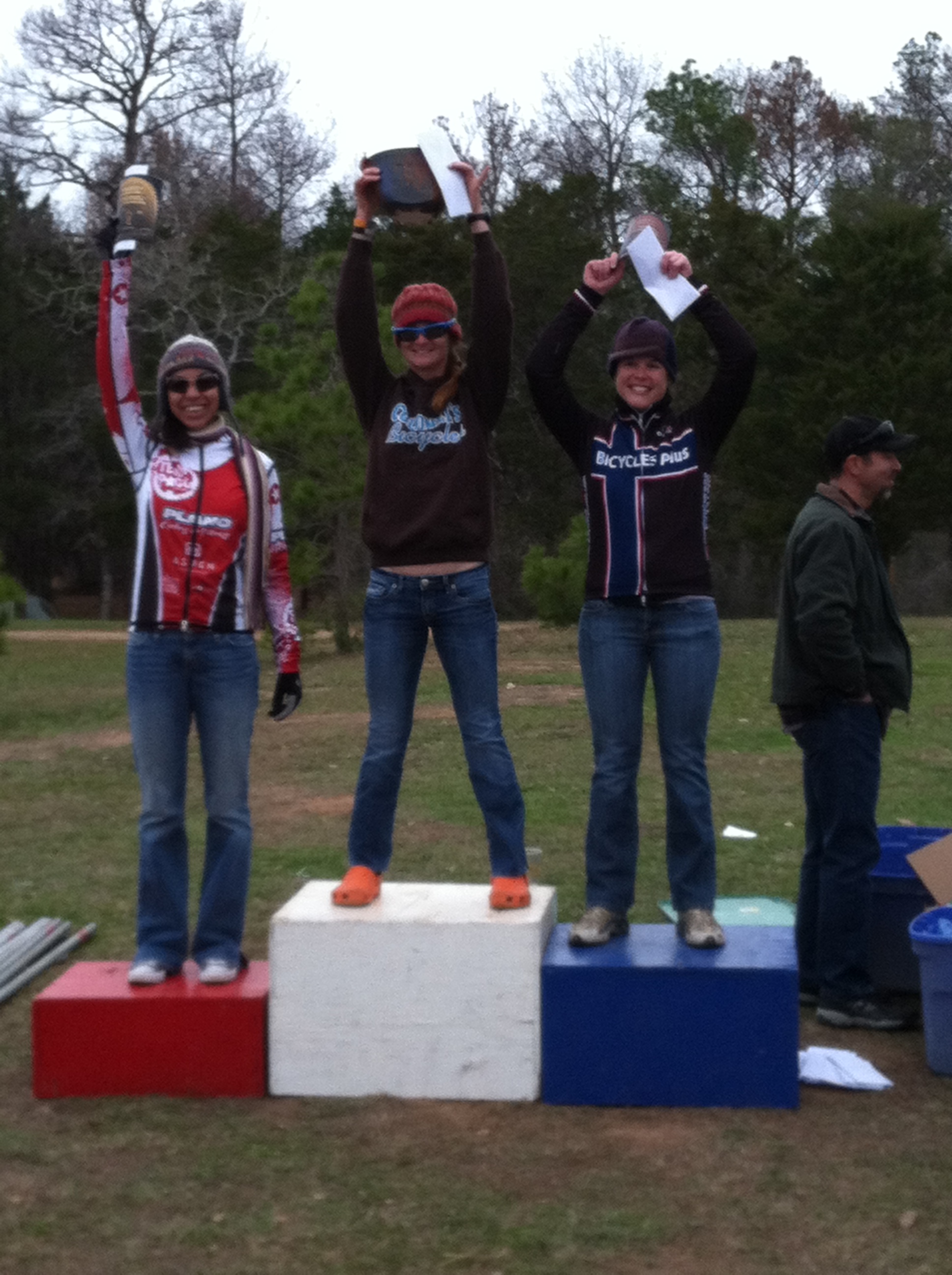 Now let’s get to the race. The first half of the race I felt ok even though it was the most technical part of the trail. There were lots and lots of rocks and a fair amount of climbing. Our technical skills can use a lot of improvement and because of that there is a lot of wasted energy among those sections. I stayed with the leaders all through the first half of the race. Going into the second half of the race, which is not as technical, I noticed my gears weren’t shifting right. I decided to stop and check my bike and sure enough my rear through axle had wiggled itself loose. This didn’t take long and before I knew it I was back on the bike. When I got to the fast and flowy spots my brain was saying “go” and my legs were saying “NO!” It seemed like I only had one speed which it wasn’t slow, but wasn’t fast enough to catch the leaders. When I was approaching the end of the race, you know that little light on the dashboard that lets you know you are running out of gas…you know the little annoying one those goes, “ding?” Well mine was on and it was ringing and blinking like you have no idea! I was just thankful that the last few miles of the race were mostly downhill. I went with everything that I had left to cross the finish line in fourth place. Carlos said he was a little worried when I was so far behind the leaders. But as he saw me from the distance, he checked for dirt and blood ; ) which he didn’t find any. So he looked at Steve and said, “she’s tired.” As I rode by them close to the finish line he asked if I was ok and the funny thing is I said, “I’m tired.” Ha ha I guess he really does know me well!