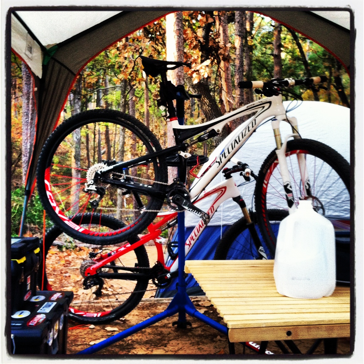 We woke up Saturday morning and Carlos headed to the bathroom to put his contacts on. As he walked back to camp I could tell something was wrong. One of his contacts had ripped and he forgot to pack an extra pair! This was NOT GOOD. He was forced to race blind. 😦 For all those that ride a bike, especially at high speeds, we all know that being able to see is pretty much at the top of the priority list, so this was really going to be a task! So, for the second year in a row we were side by side at the starting line. We took off and I stuck to his wheel like glue! It was pretty cool because that’s the view I have in every training ride we do! 🙂 For the first few miles I kept him in sight but couldn’t quite hold his wheel anymore. I made a small mistake and the two guys behind me, Billy and Tom, passed. I was now in fifth and not happy about that. I tried to keep up the pace and finally caught a glimpse of Carlos! Yay! I was descending on a long park road and he was at the bottom turning back into the trail. Once I reached the bottom I made the turn to start climbing and “snap!” My chain broke. Boo! Well, that was the end of my race so I hiked up the road and waited there for him to ride by with about a mile or so to go so I could tell him my race was over. Once he saw that I wasn’t riding on his tail he knew he could back off for the loooong climb at the end and save his legs for the race tomorrow and he ended up in 3rd!